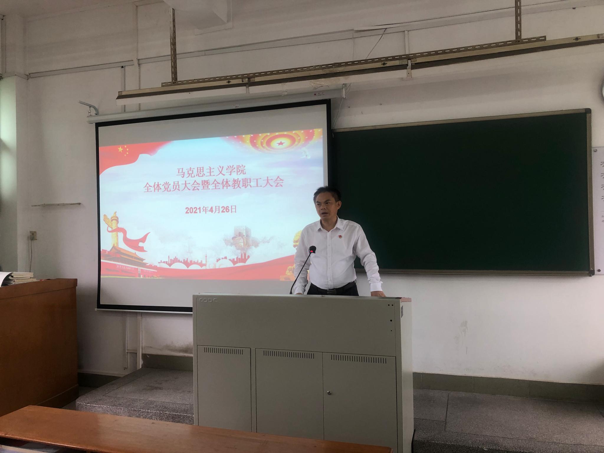 2021年4月26日上午,马克思主义学院在海珠校区教学楼904课室召开了全体党员暨全体教职工大会。专题传达了习近平总书记系列重要讲话精神及《中共广东省委印发<关于建立健全坚决落实“两个维护”十项制度机制的意见>的通知》等文件精神。15vip太阳成集团院长蔡立彬主持会议并主讲了“百年大党的红色气质:中国共产党人的精神谱系”的专题党课。15vip太阳成集团副院长秦抗抗主讲了“学习党的光辉历史,传承红色基因”的专题党课。随后,全体党员及教职工重走了中共广东省委书记李希同志考察15vip太阳集团官网的路线。